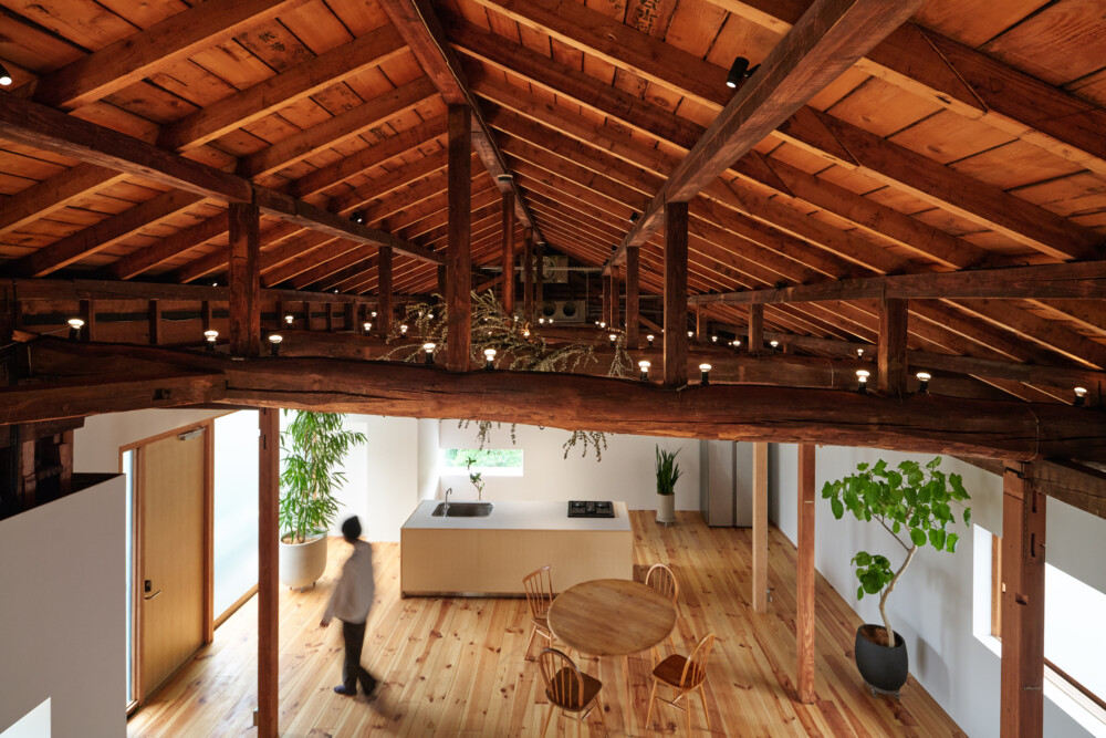 天井を撤去し梁を露出させ、撮影スタジオに相応しい天井高を確保し、照明や空調などの設備類を撮影に干渉しない高い位置に配置しなおした。照明は、空間の特徴である梁や屋根の古木材をささやかに照らし印象づける計画とした。キッチンを可動式にすることで、撮影内容にあわせた自由なレイアウトが出来る。