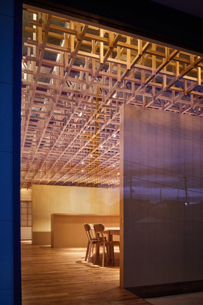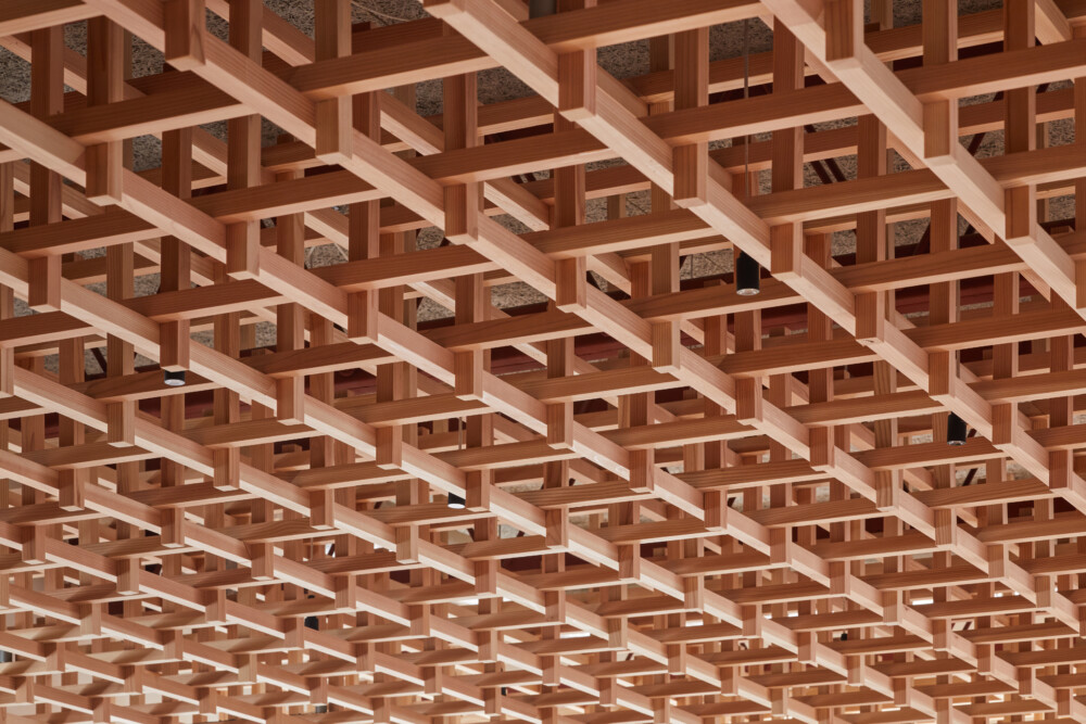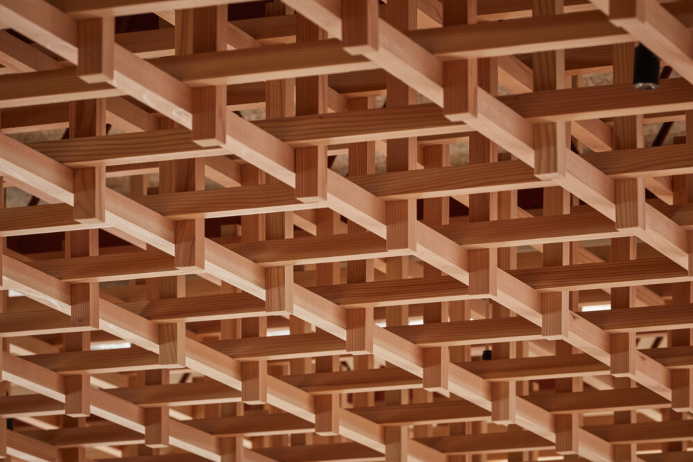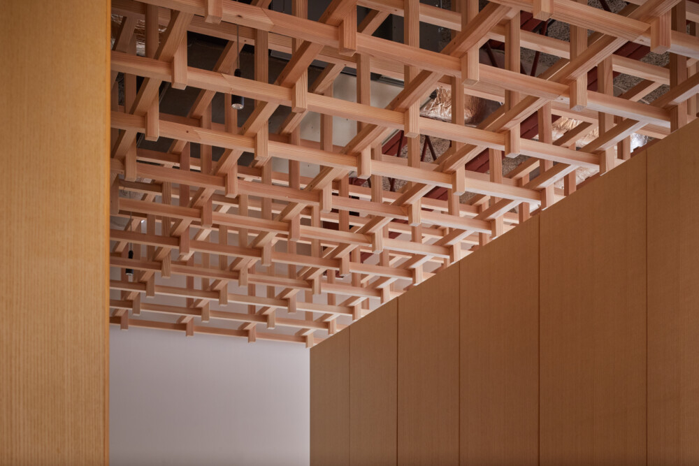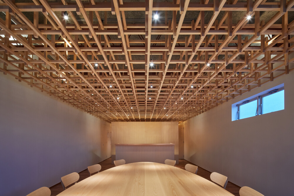 施主がもつ防雪林から木材を調達し内装に活用した。会議室に必要な性能として吸音材で天井を仕上げたうえ、杉材の立体的な格子で覆い、ウェブカメラ越しでもわかる特徴的な天井をつくった。ウェブ会議に特化したおにぎり型のテーブルを木で製作した。
