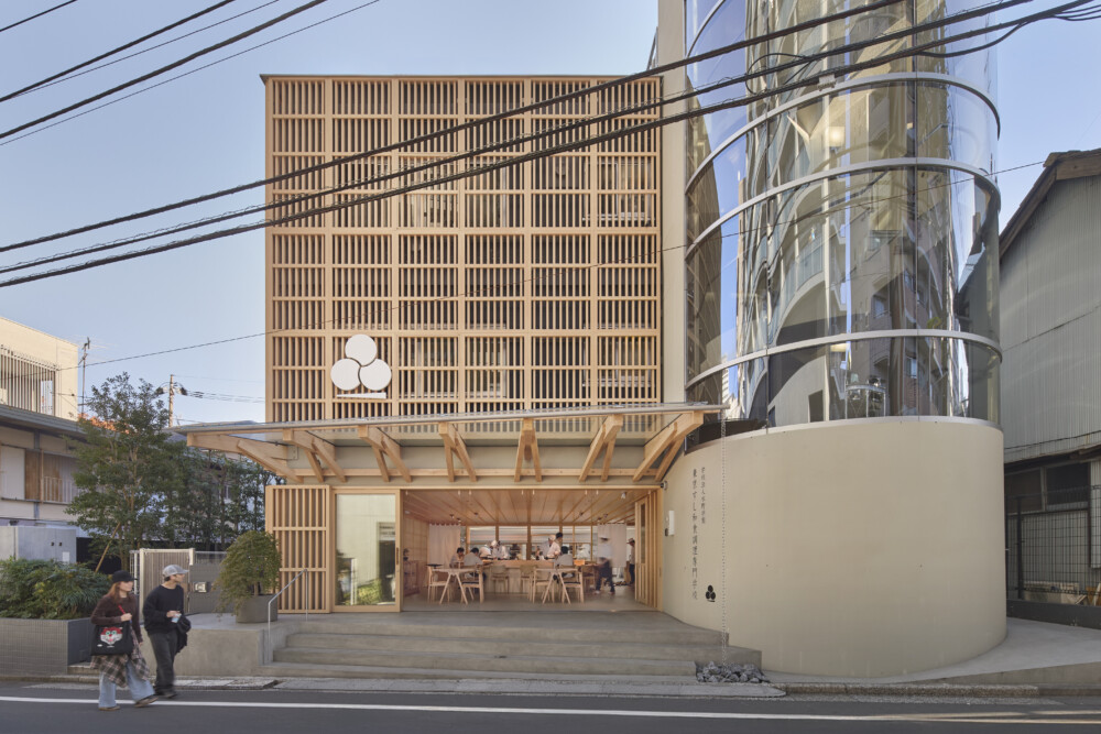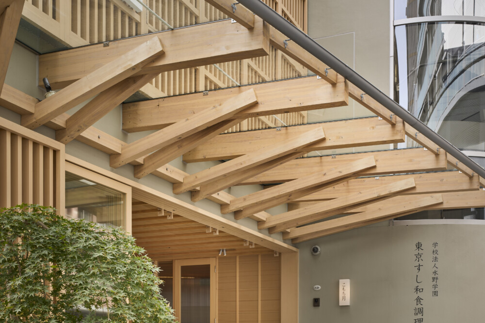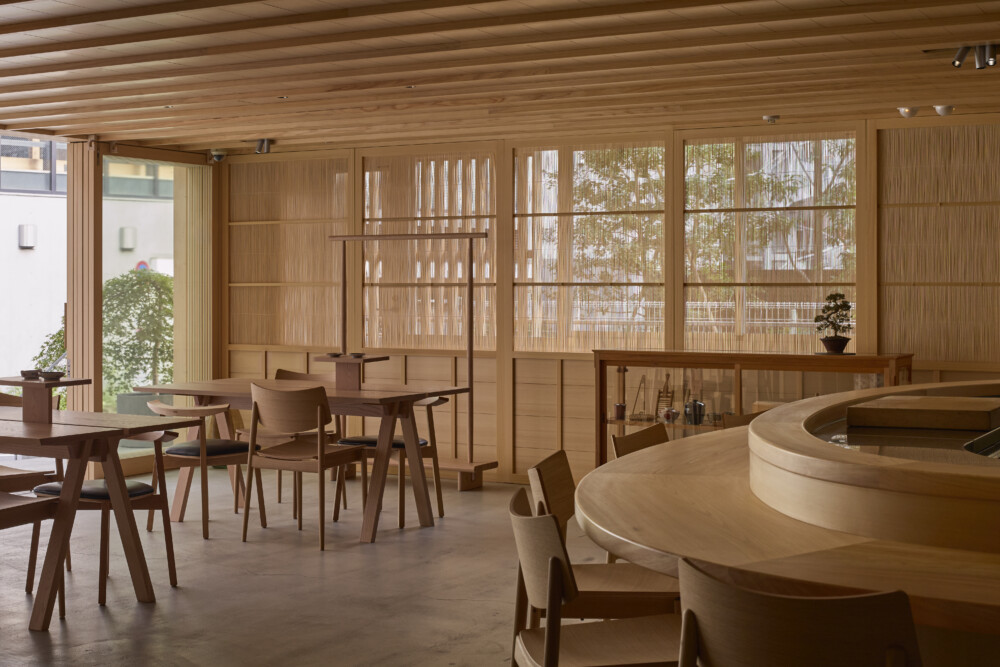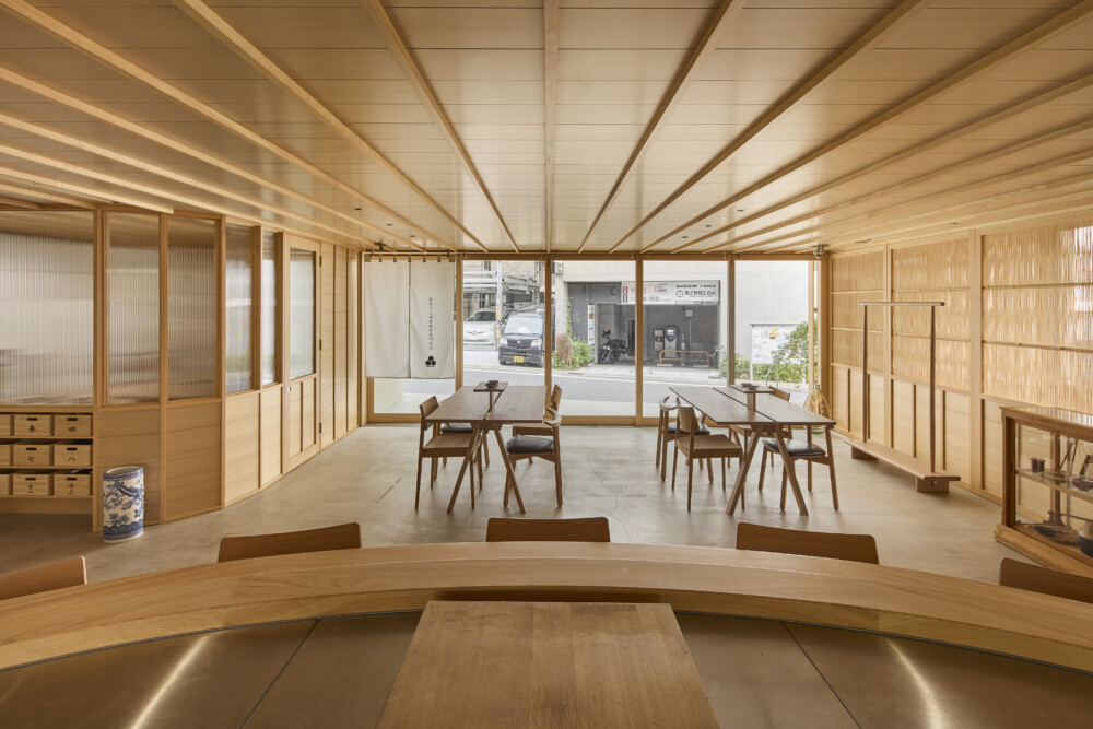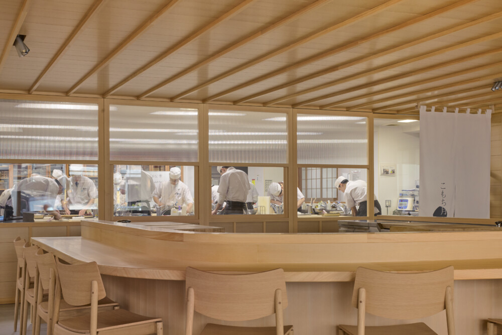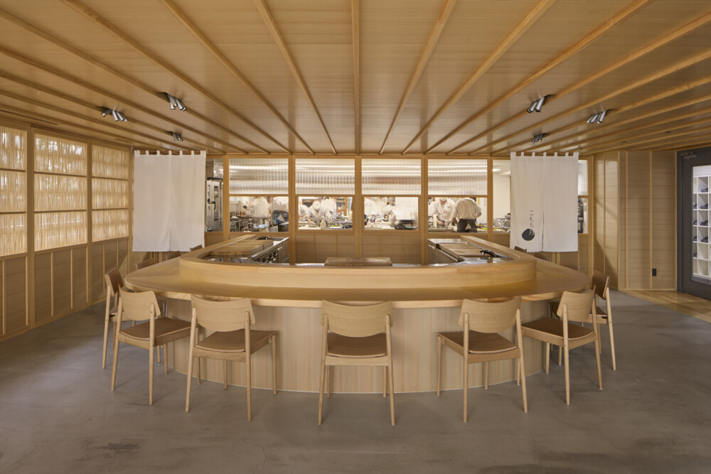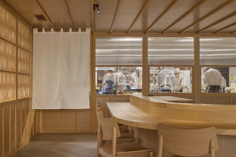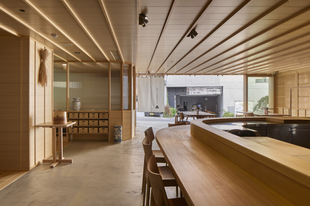 ガラスの間仕切りにより、中の様子が通りからよく見えるようにした。内外装は床を除きすべてヒノキ材で仕上げている。学生が立つ板場を舞台に見立て、視線が中央に集まるようカウンターを弧状にした。エントランスには木と強化ガラスの庇を新設し、光を取り入れる明快な構えとした。