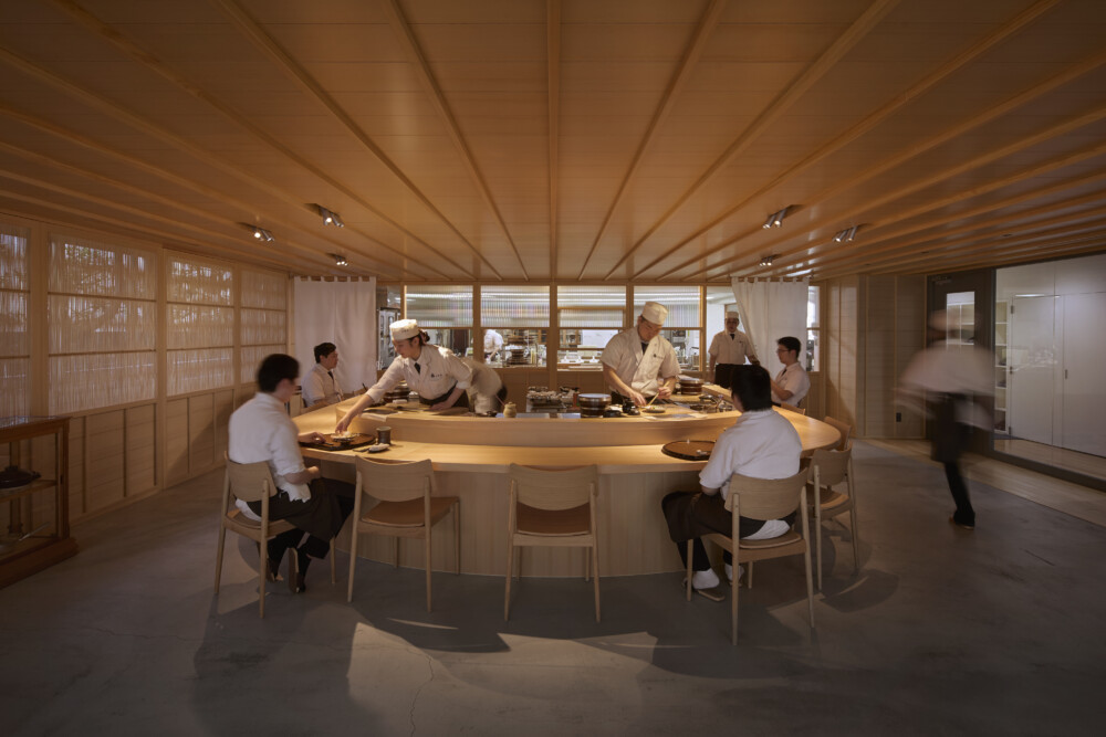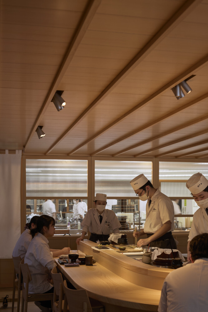 Glass partitions make the internal activities visible from the street. Except for the floor, both interior and exterior are finished in hinoki cypress. Treating the itaba (chef’s counter) as a stage, the counter is designed with a curve to draw all focus to the center. A new canopy of wood and tempered glass creates a clear, light-filled entrance.
